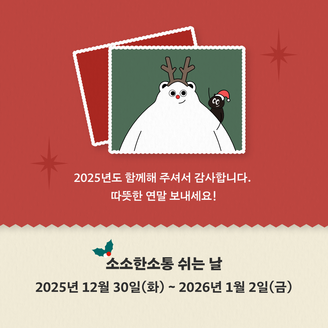 소소뉴스를 구독하시면 소소한소통이 만드는 쉬운 정보와 소식을 가장 빠르게 받아볼 수 있습니다. 구독하기 개인정보 수집 및 이용에 동의합니다.보기 [개인정보를 사용하는 것에 대한 동의] ○ 개인정보를 사용하는 이유 - <소소뉴스>를 이메일로 보내기 위해 사용합니다. ○ 사용하는 개인정보 - 이름, 이메일 주소 ○ 개인정보를 사용하는 기간 - <소소뉴스>를 그만 받겠다고 할 때까지 사용합니다. <소소뉴스>를 그만 받아보겠다고 이야기하면 지웁니다. ○ 개인정보 사용을 거절할 권리 - 원하지 않으면, 개인정보 사용을 거절해도 됩니다. 다만 <소소뉴스>를 받지 못하게 됩니다. ※ 당신의 개인정보는 위에 설명한 대로만 쓰이며, 다른 곳에 알려주지 않습니다.